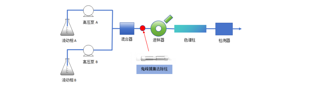 鬼峰捕集去除柱保存在純甲醇中,使用前采用純甲醇1ml/min流速?zèng)_洗20min(注意:不要連接色譜柱和檢測(cè)器進(jìn)行沖洗),沖洗好后卸下小柱,按照示意圖安裝位置,連接到混合器與進(jìn)樣器之間。(安裝時(shí)注意進(jìn)出方向)。