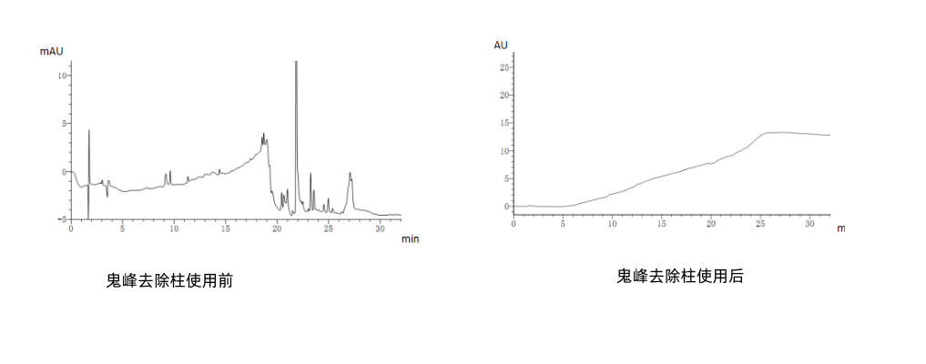 下面實(shí)例表明,將恒譜生鬼峰去除小柱安裝在混合器之后可以有效捕集流動(dòng)相引進(jìn)的雜質(zhì)。