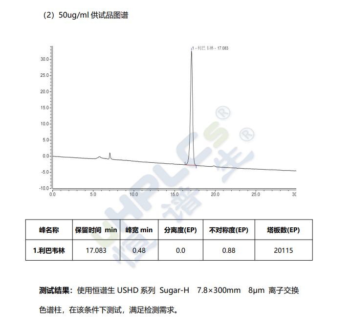 恒譜生 Sugar-H 色譜柱是嚴格按照《中國藥典》中利巴韋林有關物質檢測方法開發(fā)的分析柱。該柱基于氫型強陽離子交換樹脂,在強酸性流動相條件下可實現(xiàn)對利巴韋林及其雜質的優(yōu)異分離,保障藥品質量控制與合規(guī)性檢測的需求。