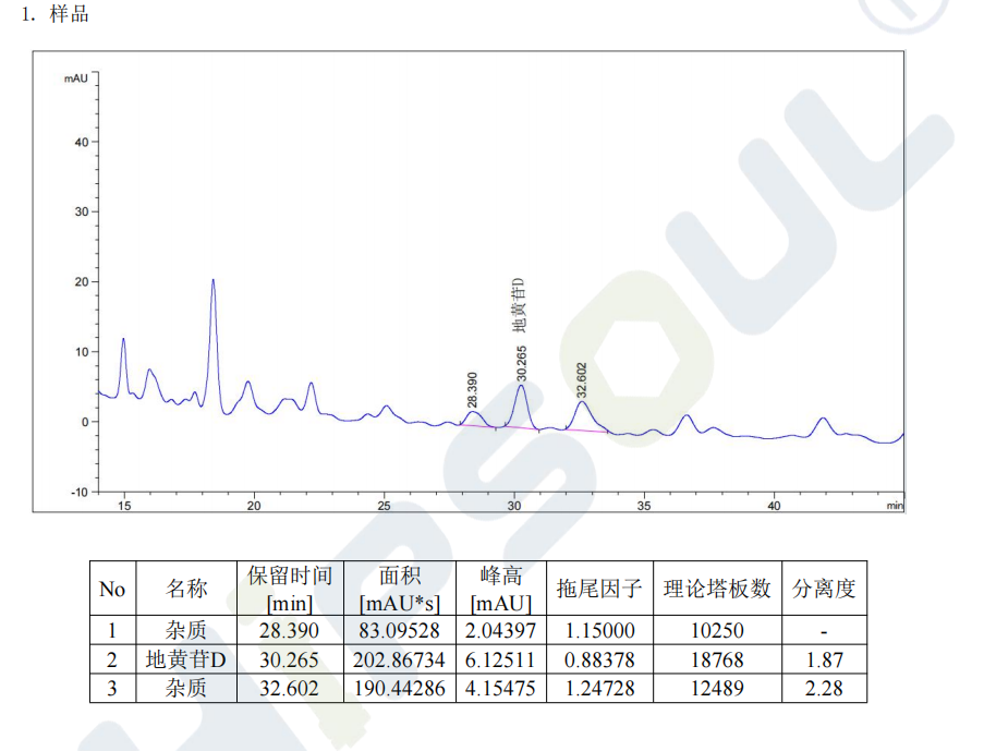 ?? 地黃苷 D 分離檢測:依托 USHD C18-AR 5μm, 120?,4.6mm×250mm 色譜柱,以甲醇 / 0.1% 磷酸為流動相,實現地黃苷 D 與雜質的基線分離,拖尾因子理想,完全滿足中國藥典檢測標準,為中藥有效成分分析保駕護航。
