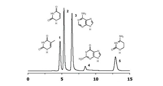 磺酸烷基甜菜堿具有離子對色譜中反離子的作用,磺酸根帶負電荷對帶正電的分析物有靜電作用,甜菜堿帶正電荷對帶負電的分析物有靜電作用,磺酸根在外側,因此對帶正電的化合物靜電作用更強。對于嘌呤和嘧啶等元素有著非常突出的分離效果(具體分離情況如下圖所示)。
